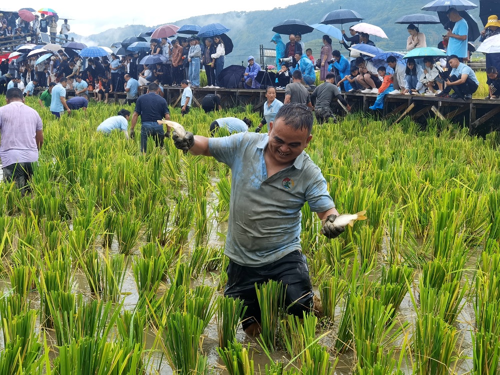 当天,捉鱼比赛、徒手捉鱼体验在稻田公园火热开场。参赛者挽着裤腿踩进田里,雨水混着泥水溅满衣裤,却挡不住追逐稻花鱼的欢腾——有人俯身追鱼,有人伸手合围,笑声、欢呼声裹着雨丝,荡漾在绿水青山间。