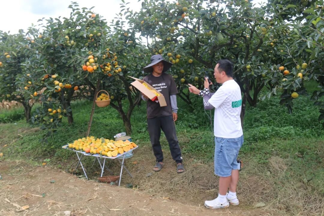 金秋十月,保山大地处处硕果累累。施甸县仁和镇五楼村甜柿基地,每天上午都会进行直播带货。走进其中一家,只见两名主播在大声叫卖,其中一人端着一纸箱甜柿、另一人持手机拍摄,二人或通过讨论讲解甜柿的口感优势、或通过提问引导观众了解购买方式,音响里不时播放着阵阵音乐。他们身后大片甜柿树上,是个头饱满、泛着橙色光芒的甜柿。树下那张小桌子上铺满了切开的甜柿,看上去令人垂涎欲滴。