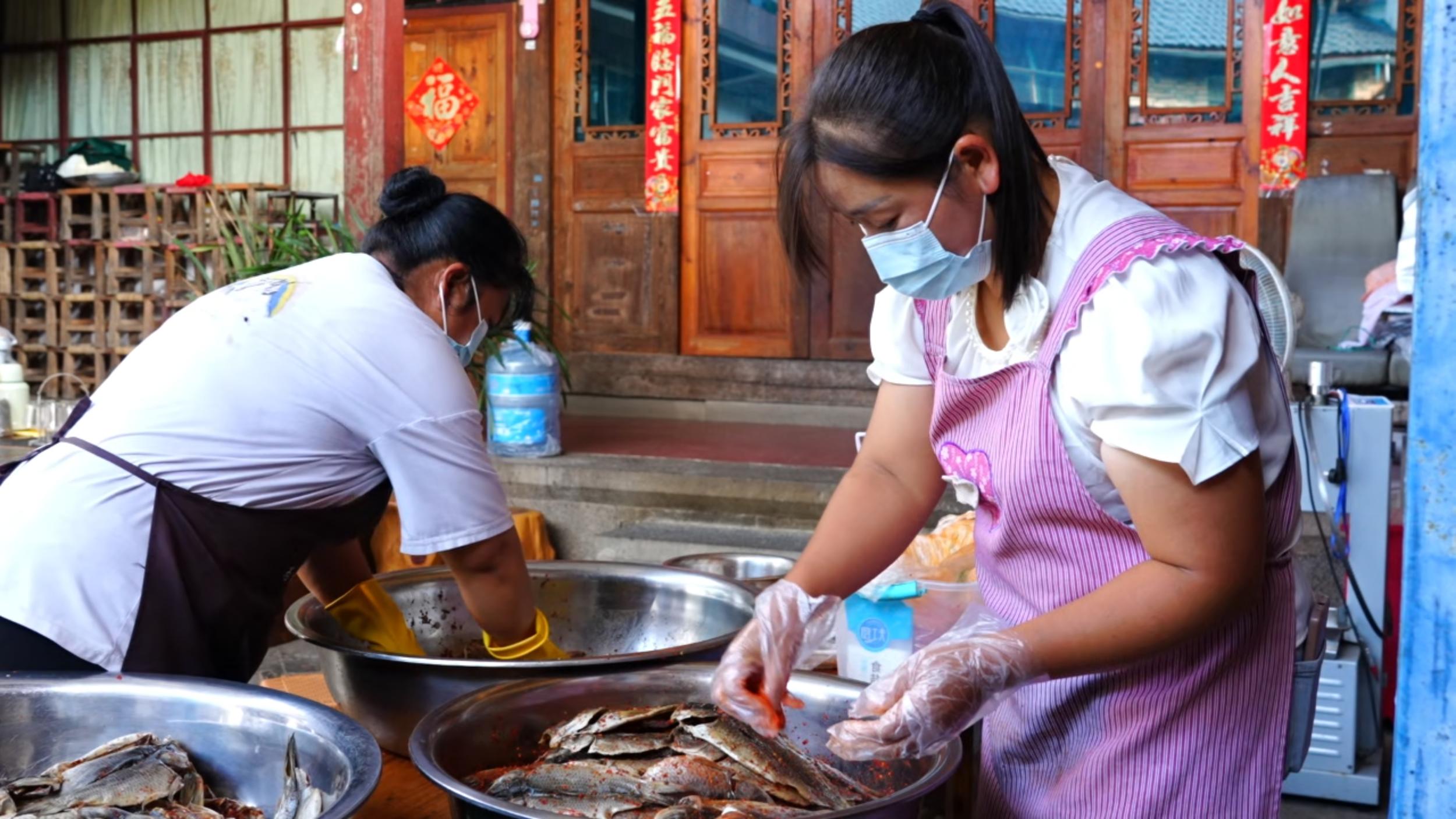 为延长稻花鱼的销售周期,不少农户开始尝试加工环节。在赧等村村民鲁大秀家中,一家人正忙着将新鲜稻花鱼清洗、腌制、晾晒,制成风味鱼干。
