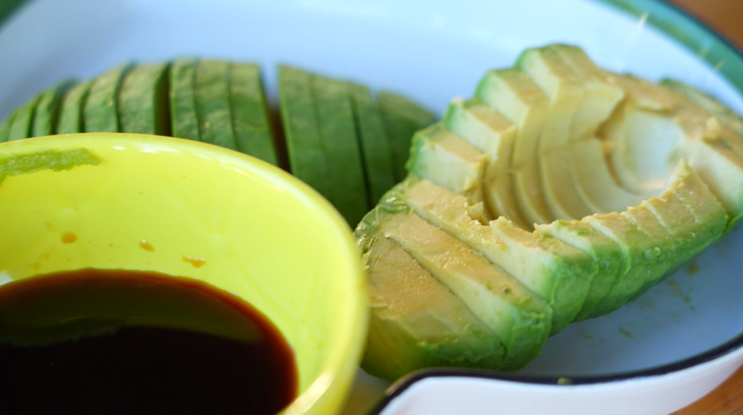 牛油刺身:取一个成熟度刚好的新鲜牛油果,去皮后用刀切成厚薄均匀的片状整齐摆放,再准备一个小调料碗,倒入适量酱油,芥末搅拌至融化。将牛油果片轻轻蘸上调配好的芥末酱油,入口清爽,尽显食材本身的鲜美。