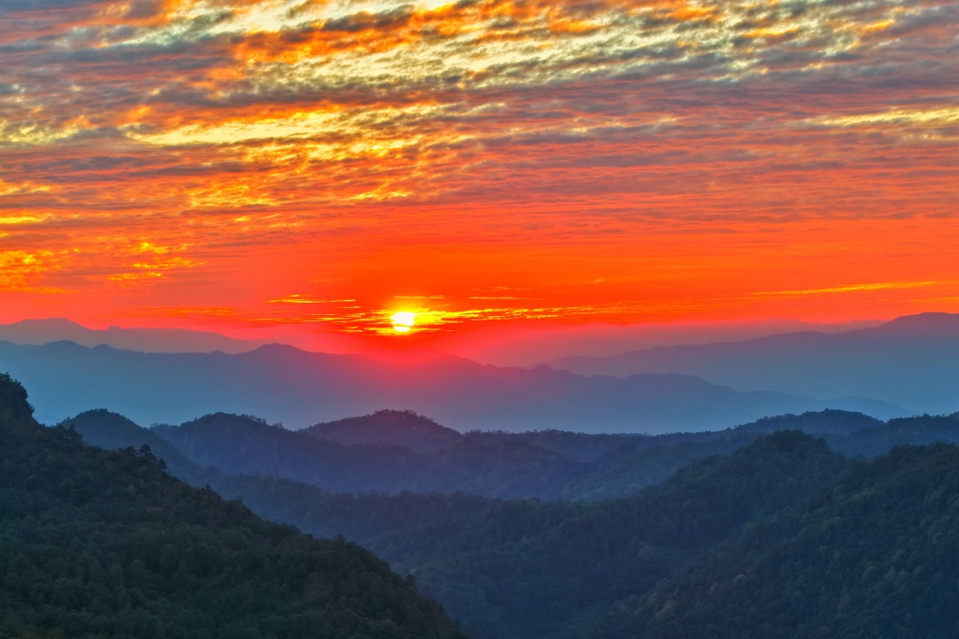 随着暮色渐浓,晚霞的色彩开始层层递进。橘红渐渐褪去,玫粉与绛紫接踵而至,将天空晕染成一幅流动的油画。云朵被撕扯成细碎的模样,有的如轻纱飘浮,有的似棉絮堆叠,光影在云层间穿梭,明暗交错间,连远处的山峦都化作朦胧的剪影。昌宁的晚霞从不会吝啬它的层次,浅紫、深绯、鹅黄……各色光影在天际碰撞、融合,最终化作一片温柔的暮色,将茶山、村寨轻轻拥入怀中。