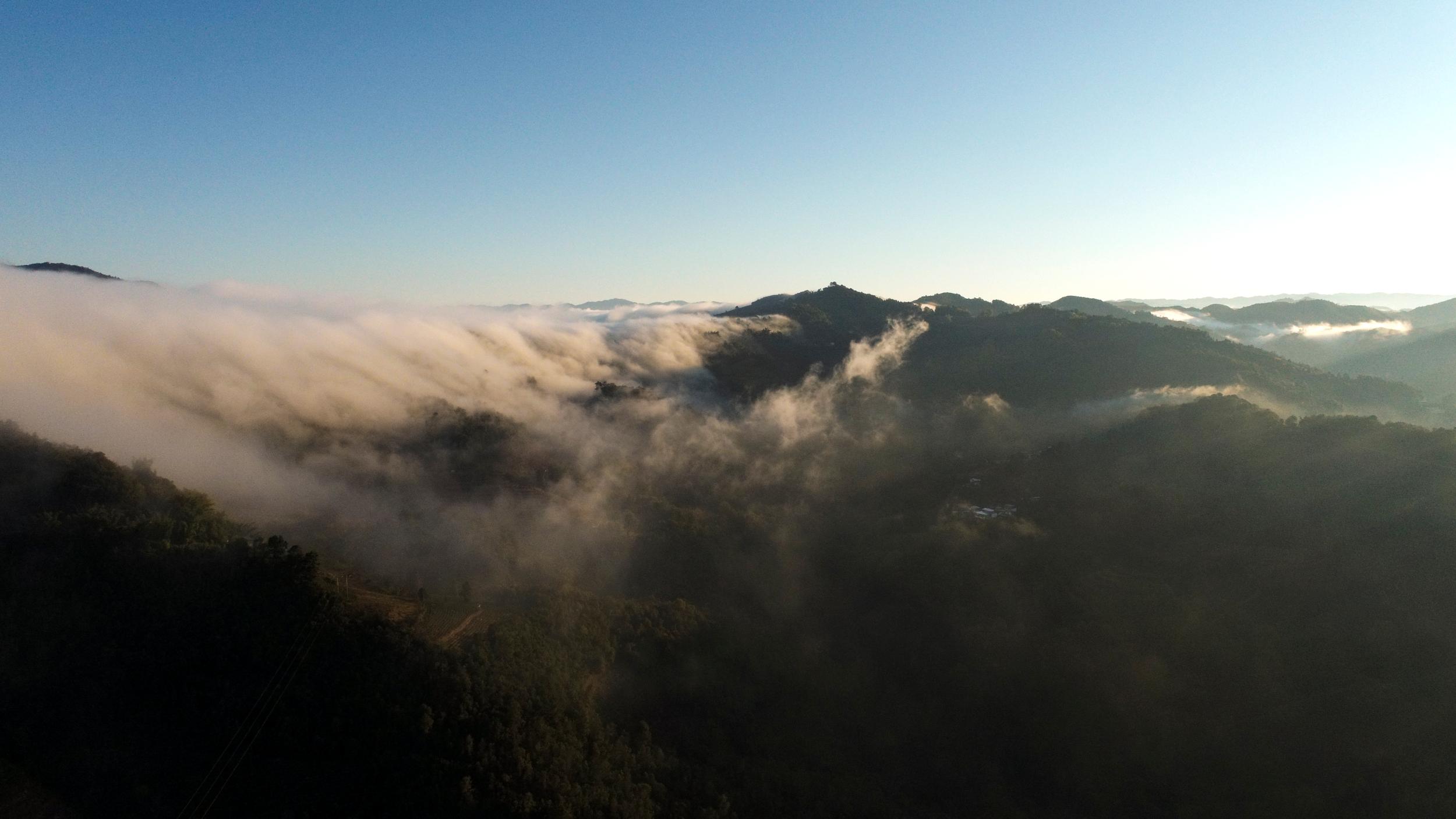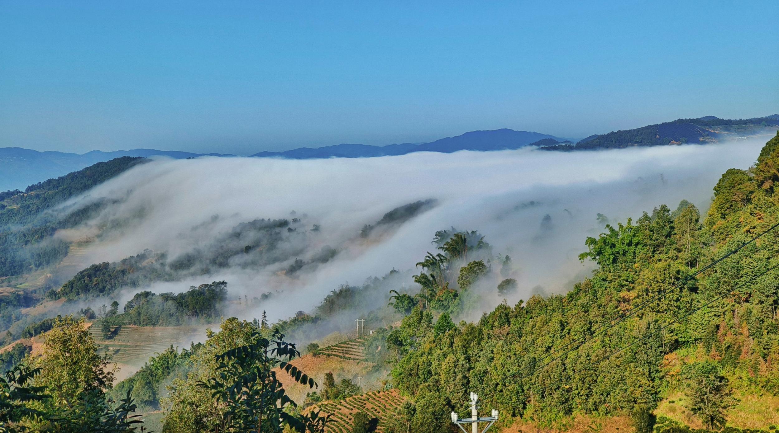 该区域山谷纵深,水汽充沛。来自澜沧江支流的水汽持续蒸腾上升,昼夜温差常达15℃以上。清晨时分,冷空气沉积谷底,暖湿气流沿山坡爬升,至一定高度后迅速凝结成云。随着朝阳初升,阳光穿透云层,为云瀑镀上金边。受光照增温与地形影响,积聚在山腰的浓密云团顺陡峭山势倾泻而下,宛如天空开启“闸门”,云由静转动,形成奔涌的“云河”。
