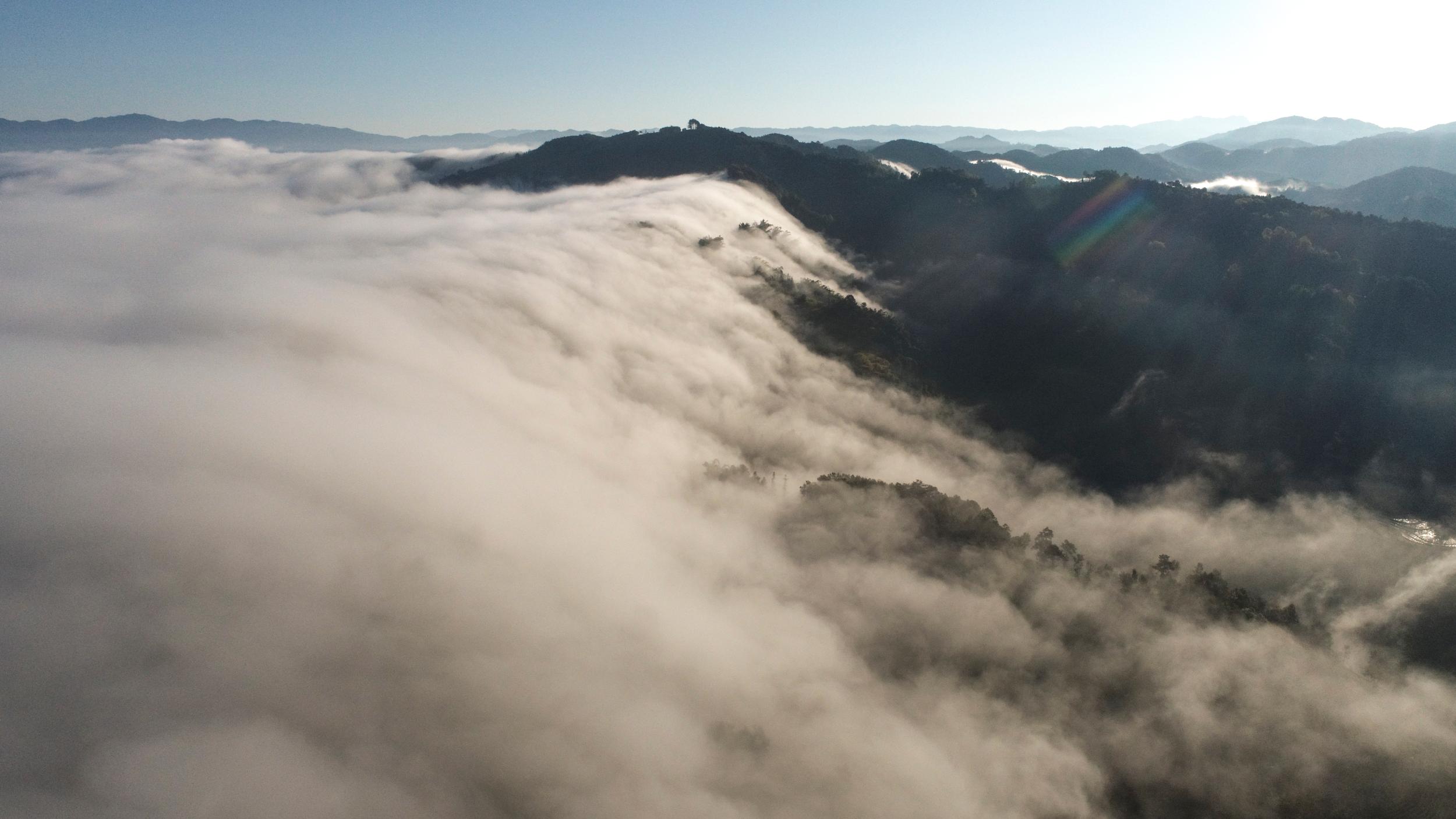 远望可见云潮从山顶溢流,铺满整片U形山谷,如悬空白练,又似雪浪倾泻;近观则见云涛起伏,时而翻涌如沸,时而平静如缎,在风力作用下沿山势缓慢流动。山谷间层林尽染,枫红栎黄与乳白流云相互映衬,构成一幅冷暖交融、动静相宜的自然画卷。