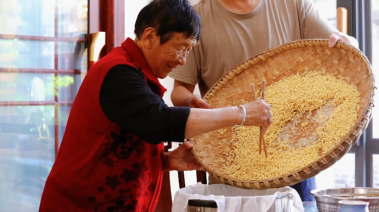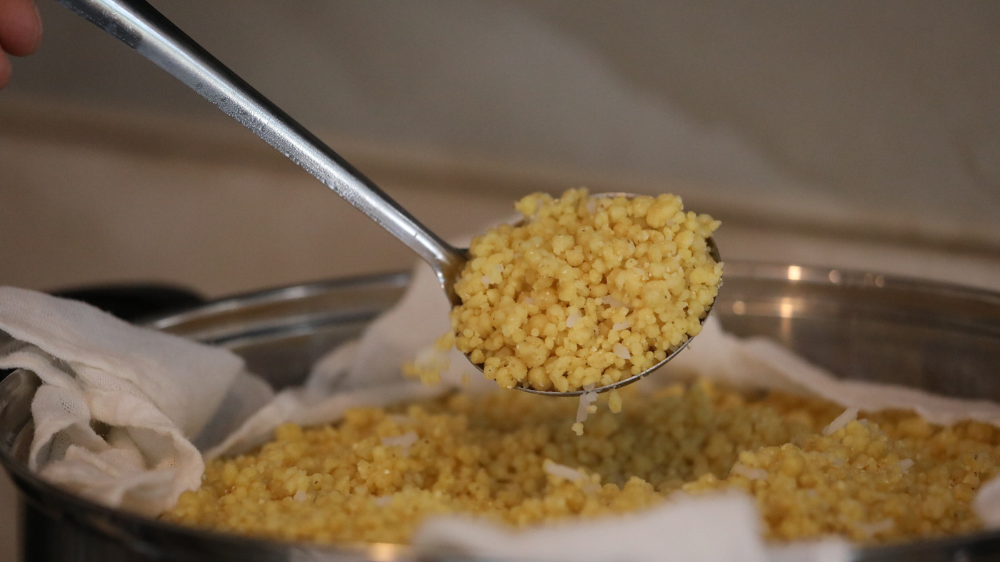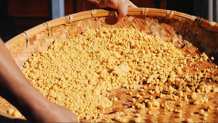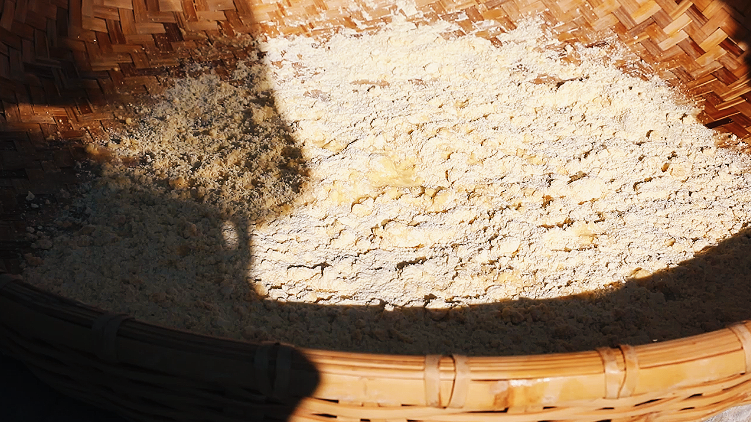 制作始于“湿面”。老师傅将玉米面铺于竹簸箕中,手执小瓢精准洒水,水量全凭经验拿捏,力求每粒干粉均匀受潮。接着进入核心的“簸面”环节:双手紧握簸箕,手腕发力,时而旋转时而颠簸,让湿润的面粉在持续的“唰唰”声中翻滚碰撞,逐渐聚成颗粒雏形。