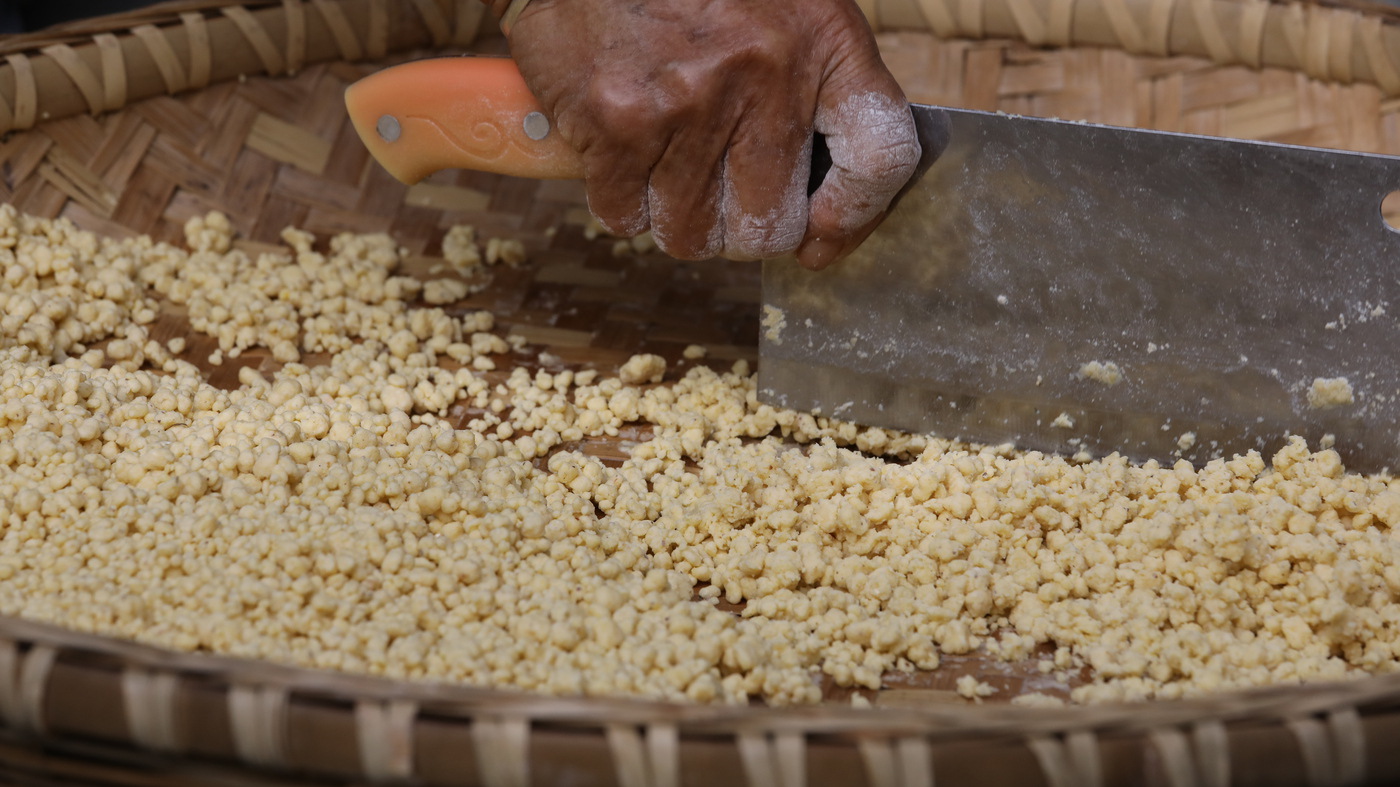 为使颗粒匀称,“剁面”不可或缺。菜刀沿簸箕边缘快速起落,将过大面块切小,同时根据干湿适时补水。最后的“滚面”堪称点睛之笔,手腕力道转为轻柔,让面果儿在簸箕中长时间旋转滚动,表面逐渐沾粉、变得光滑圆润,直至颗颗如米粒般匀称分明。