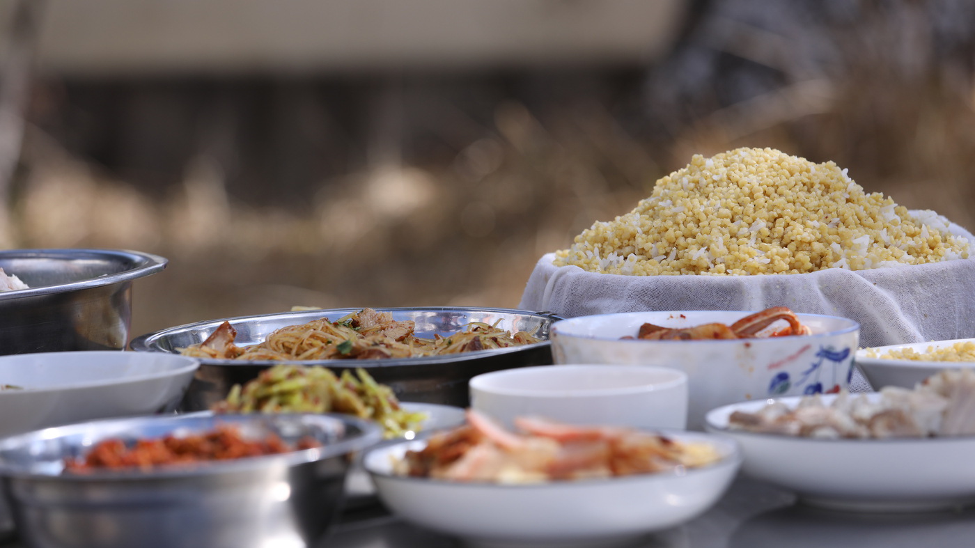 蒸制好的面果儿,通常与米饭同蒸。出锅时,上层面果儿金黄油亮,下层米饭洁白饱满,玉米浓香扑鼻。地道的吃法是配以农家酸腌菜、豆豉酱,入口粗粝中带着谷物清甜,质朴而温暖。