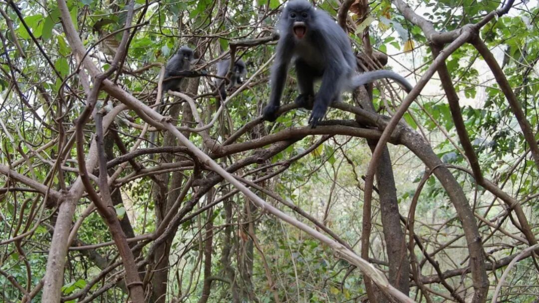 然后,第二个、第三个身影从浓绿深处浮现——一个完整的灰叶猴家族,在晨光中开始了它们新的一天。