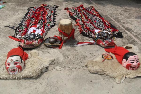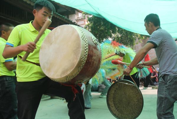 麒麟狮舞,开场以“串花”绕场,营造出一种灵动而祥和的氛围,紧接着是“苍蝇搓脚”三步进退,动作轻盈且富有节奏感。随后的洪拳表演,拳风刚劲有力,相传此拳法源自少林,具有驱邪除煞的寓意。表演中,喜神会闪亮登场,或头戴“大头包包”面具,或扮作笑和尚模样,身着翻毛皮衣,有时还会有孙悟空相伴左右。引狮人手持贡香、茶酒、鲜果,逗引麒麟狮子翩翩起舞。倘若遇到丧仪,喜神还会有哭丧之仪;在“骑狮”环节,喜神轻轻执起鲜果,诱使狮子俯首,然后翩然骑乘;到了“喝彩”之时,金狮静卧一旁,赞词声调抑扬顿挫,与鼓乐和谐共鸣——司乐二人,一人击鼓,另一人兼奏锣、铓、钹三器。礼毕,以红白彩缎赏赐狮子,寓意着吉祥如意。