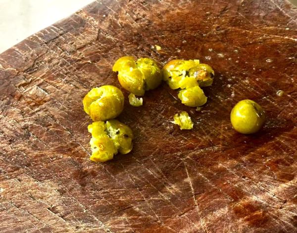 选料见真章,地道做法需取橄榄寨现摘的饱满青橄榄。洗净后用刀背轻拍至微裂,这一拍,破了它的“韧劲儿”,开了入味的门,却仍守住果肉的鲜脆。