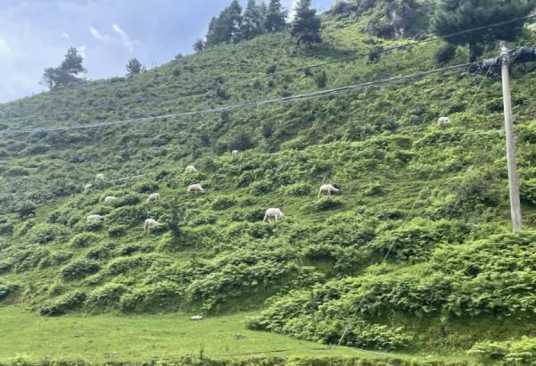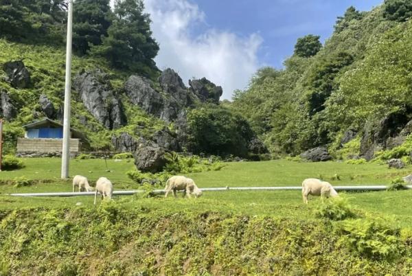 穿林而过,眼前豁然开朗。万亩草场在冬日里泛着暖绿,风过处草浪翻涌如海,草间低伏着成群的牛羊。洁白的绵羊悠然地穿梭其间,远处黄牛颈上的铃铛“叮当”作响。这“风吹草低见牛羊”的画面,与缓缓转动的风车、天际绵延的群山,共同构成一首流动的山野诗篇。