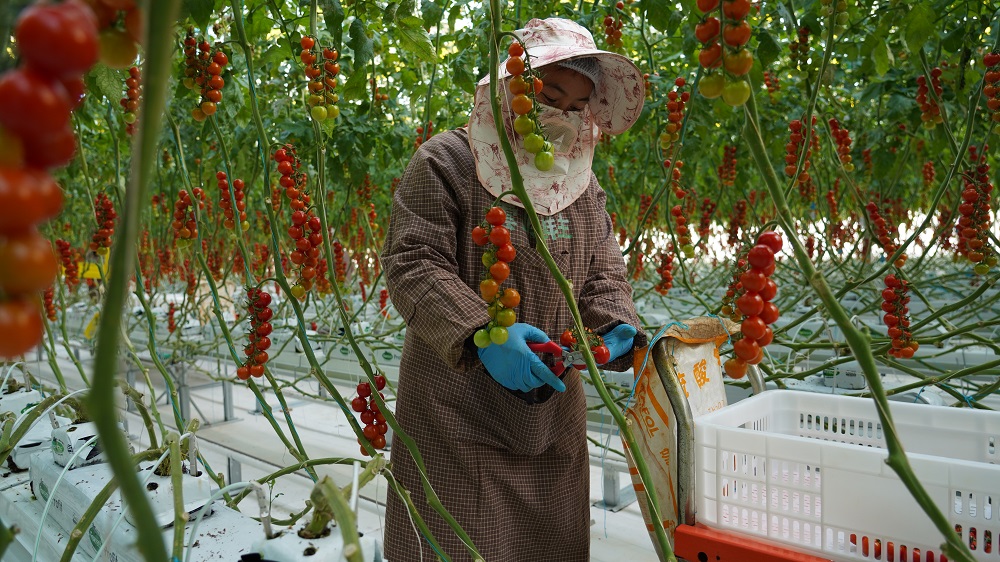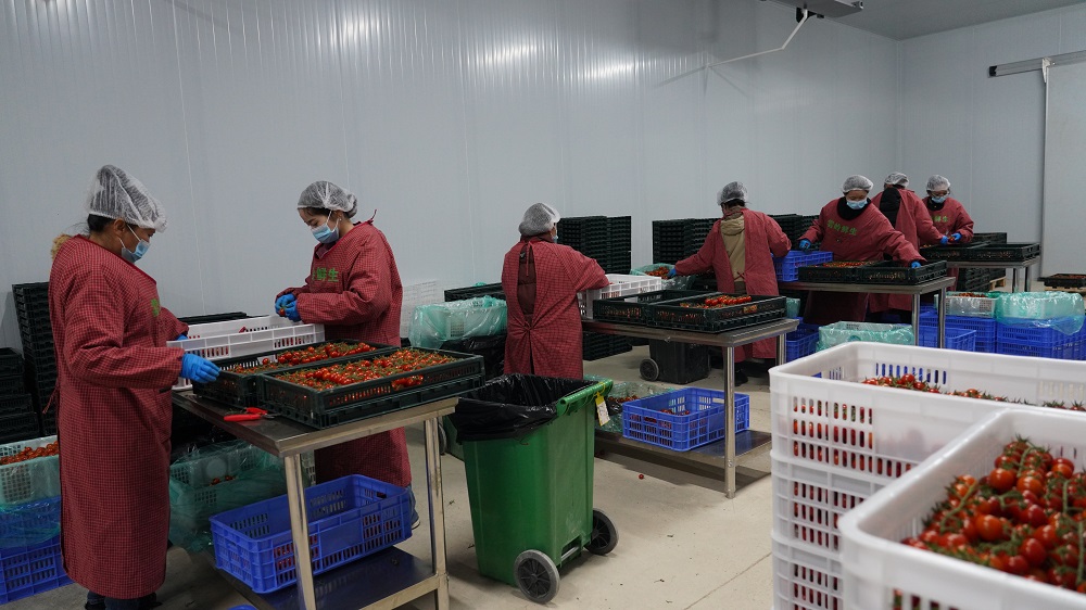 走进项目园,工人们驾驶着采摘车,穿梭在生产区,剪下一串串果实,随后送到包装区分拣、包装,眼前一片忙碌的丰收景象。
