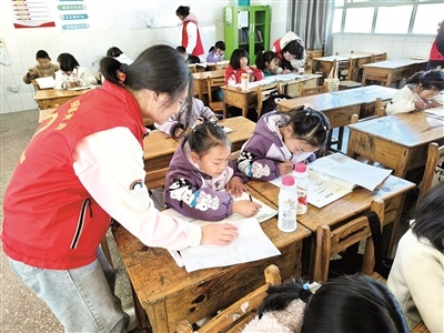 志愿者为孩子们辅导寒假作业。杨磊荣 摄