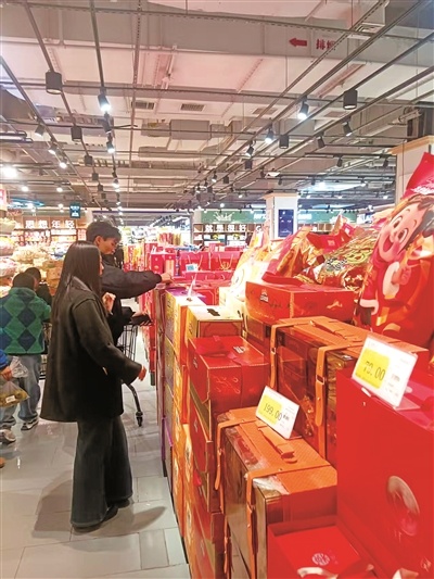 各大商超早已披上“红妆”,开启“年货模式”。走进吾悦广场的大尔多超市,红灯笼、中国结将卖场装点得年味十足。本地的火腿、腊肉、饵丝等被摆放在显眼位置,礼盒装的年货满足走亲访友需求。线上销售同样火热,本地电商平台配送繁忙,让市民动动手指就能备齐年货。