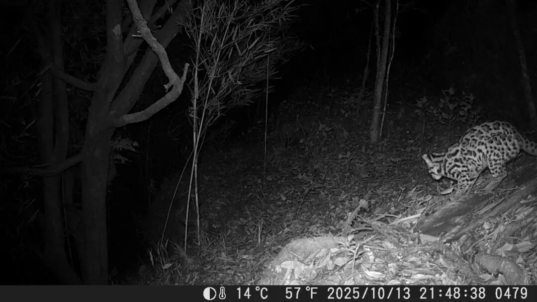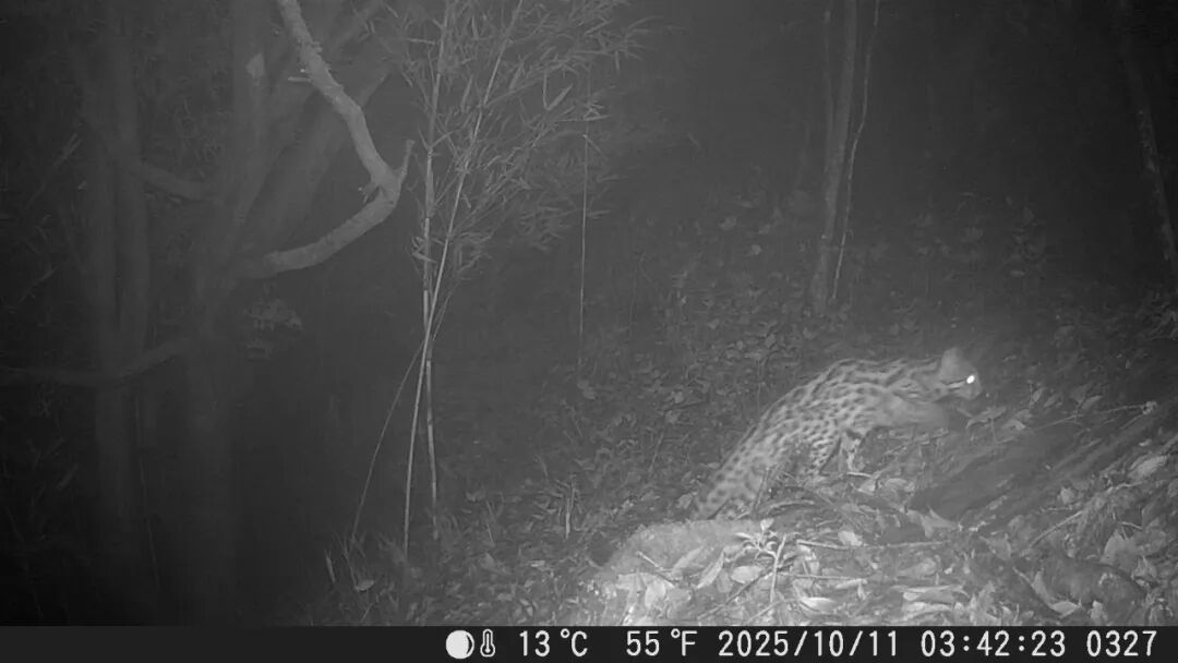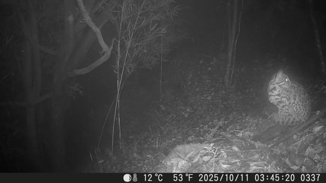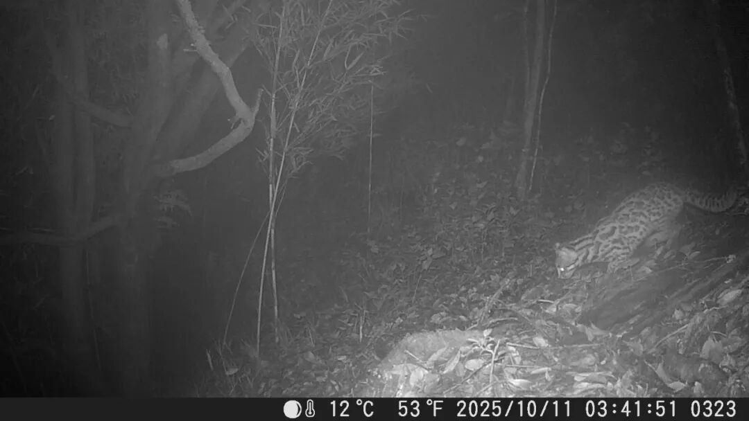 画面显示,深夜3时41分51秒,一只体格健硕的成年豹猫躬身前行,小心翼翼地出现在镜头中。它匍匐前进的同时,不断用灵敏的鼻子嗅闻地面气味,随后调转身形退后数步,趴在几段枯枝间,时而转头四顾,时而晃动耳朵捕捉周围动静,警惕性十足。片刻之后,这只豹猫缓缓坐起、伸直上身向远方张望,随即再次卧倒;紧接着又起身绕此前卧过的区域转圈嗅闻,换一处位置重复卧躺动作,反复确认领地的舒适度与安全性。经过多轮探查,豹猫两度离开镜头向远处林区延伸踏勘,最终返回核心区域。“从豹猫的一系列行为来看,它正在开展‘领地’标记与环境感知。豹猫嗅觉极为灵敏,反复嗅闻是为了确认区域内的气味信息,同时通过身上的气味腺悄悄标记领地、宣示主权。”昌宁澜沧江县级自然保护区江边管护所副所长鲁健城介绍。