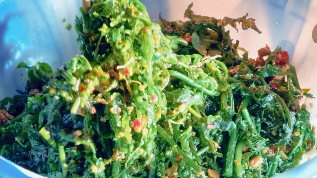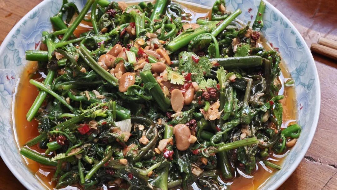 滚水汆烫后浸入山泉,拌上酸萝卜、生蒜与胡辣子,青碧映红油,一筷入口,脆嫩无比,仿佛咬醒了整个春天。