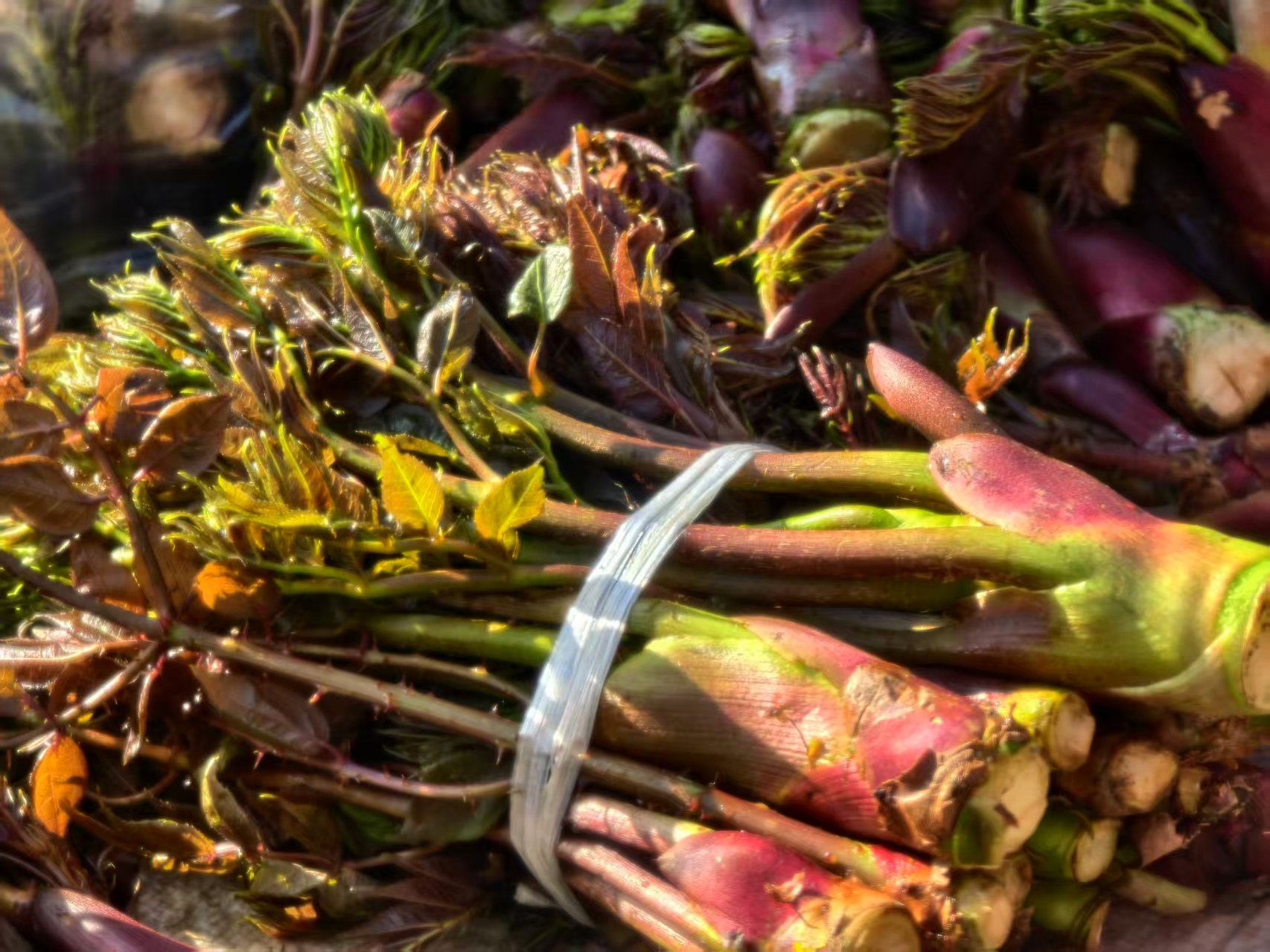 天刚蒙蒙亮,板桥镇青龙街的青石板路还有着晨露,脚步声、吆喝声便唤醒了千年古街。早市摊位沿街铺开,满眼皆是鲜活的绿意与嫩黄,蕨菜挺括、刺老苞饱满,鱼腥草红根白叶沾着泥土,头茬香椿的清香漫溢半条街,黄澄澄的枇杷堆成小丘,果香与菜鲜交织,引得行人驻足。摊前热闹,姑娘询价,摊主热情支招。老街坊在闲谈间,说着野菜里的故土情怀,一句“不尝这口鲜,春天就缺了味道”,道尽了保山人与春菜的羁绊。板桥人吃春菜讲究本味,焯水凉拌的蕨菜、金雀花炒鸡蛋、香椿煎蛋,每一道家常做法,都藏着生活的意趣与家乡的滋味。