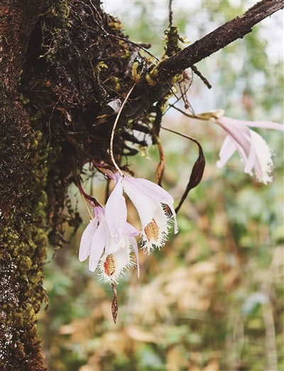 近日,保山市龙陵小黑山省级自然保护区工作人员开展野生植物监测时,发现几株白花独蒜兰悄然绽放在树干之上,素净花朵点缀幽谷,成为山间生态画卷中一抹亮色。