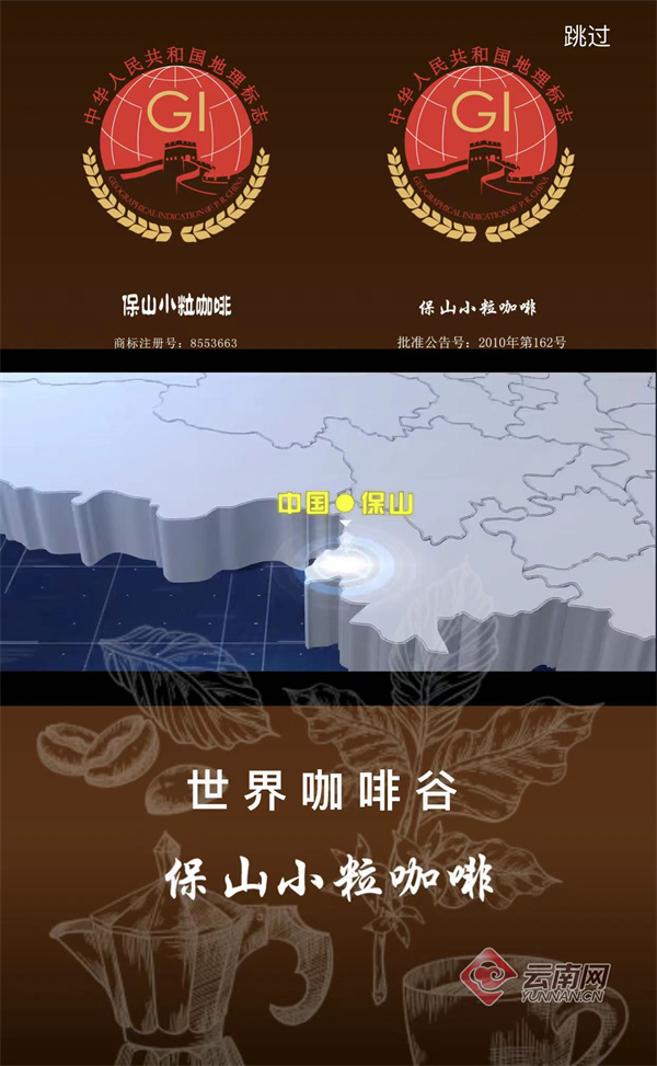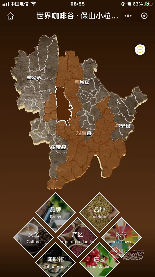 “世界咖啡谷•保山小粒咖啡”小程序启动页展示了《保山小粒咖啡宣传片》,通过视频让用户了解保山小粒咖啡发展史,首页上方的地图都可实现点击交互,并获取到相关地理气象数据,下方展示了产区、品牌、品种、庄园等七个板块菜单,让用户身临其境体验保山小粒咖啡,从一粒种子到一杯咖啡的咖啡之旅。