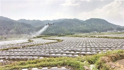 机耕服务队在操作无人机给烤烟喷洒农药。