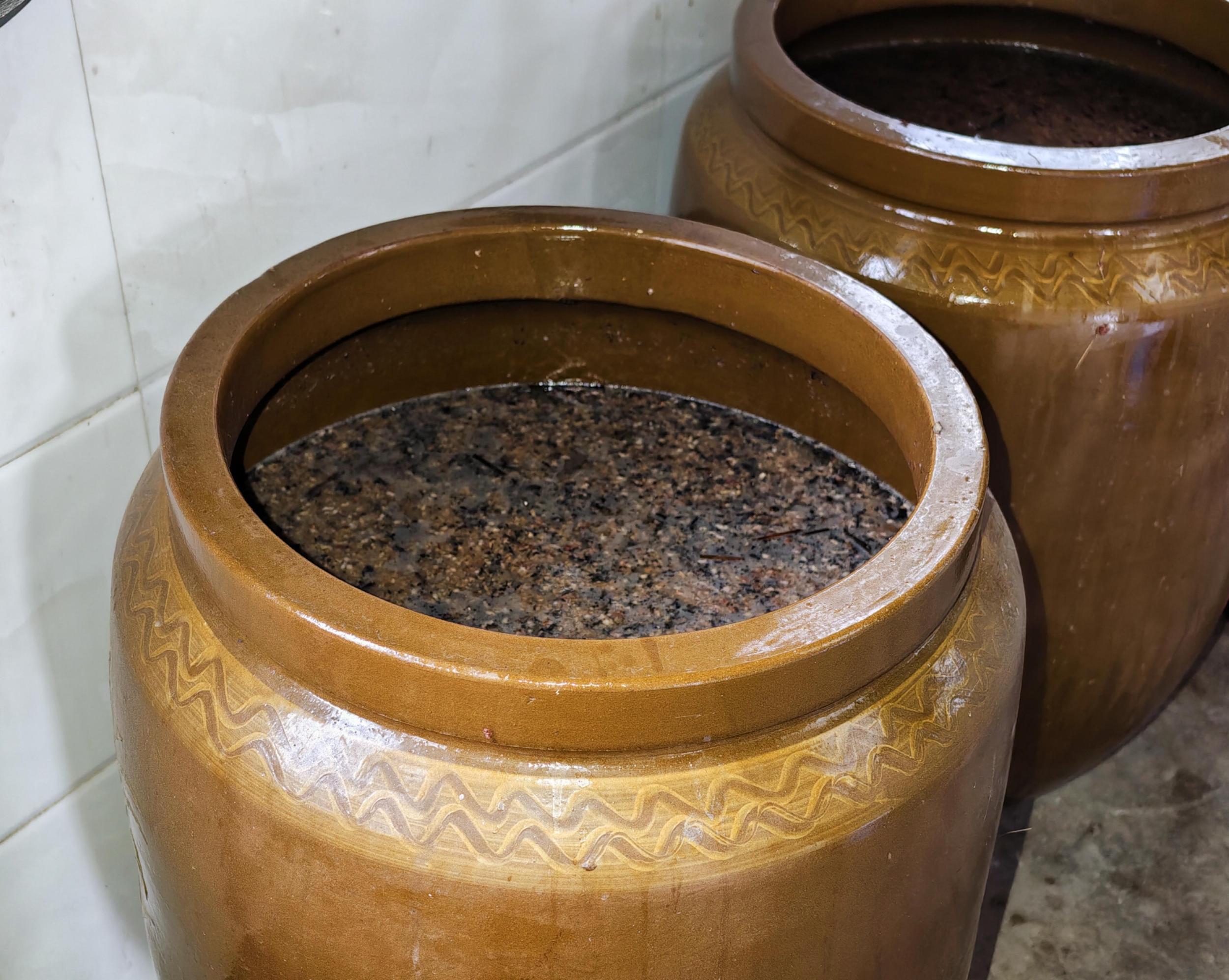 百草曲成,真正的淬炼方才开始。采用上好的红米进行熬煮,以陶瓷大缸为窖池,隔绝地气防菌,置于阳光常晒墙面之下。红米熬煮软烂后与百草曲拌匀入窖,温度全凭掌心感知,新一轮的发酵开始了。