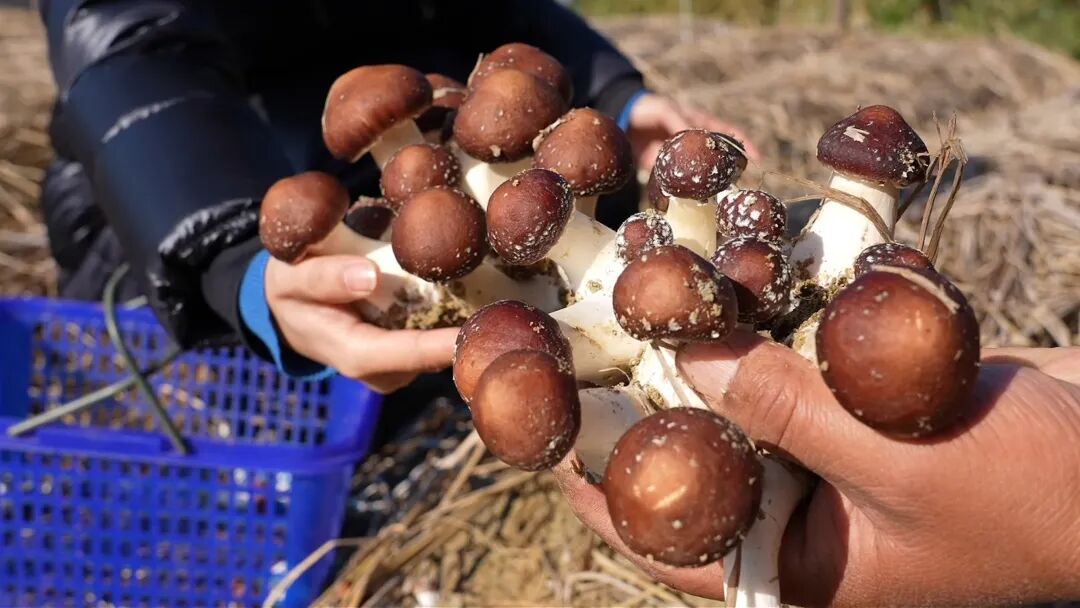 清晨,村民赵新华背着竹篓走进后山。轻轻拨开覆盖的稻草,一簇簇肥嫩饱满的赤松茸映入眼帘。“今年长得特别好,一窝能出七八朵。”他一边采收一边介绍,“林子里湿度稳、温度匀,比稻田种植的能早收十来天,口感也更鲜。”